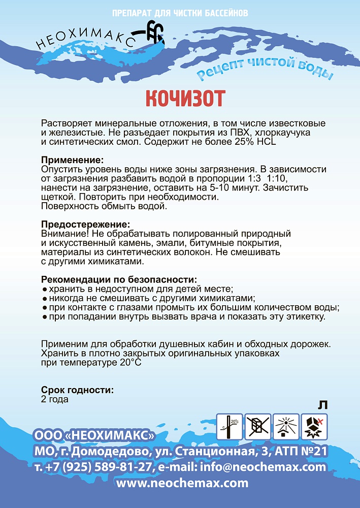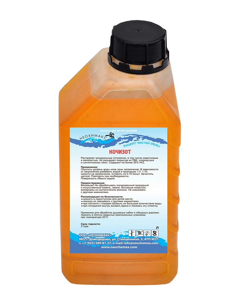 Препарат растворяет минеральные отложения, в том числе известковые и железистые. Не разъедает покрытия ПВХ, хлоркаучука и синтетических смол. Чем мыть бассейн - средством Кочизот.