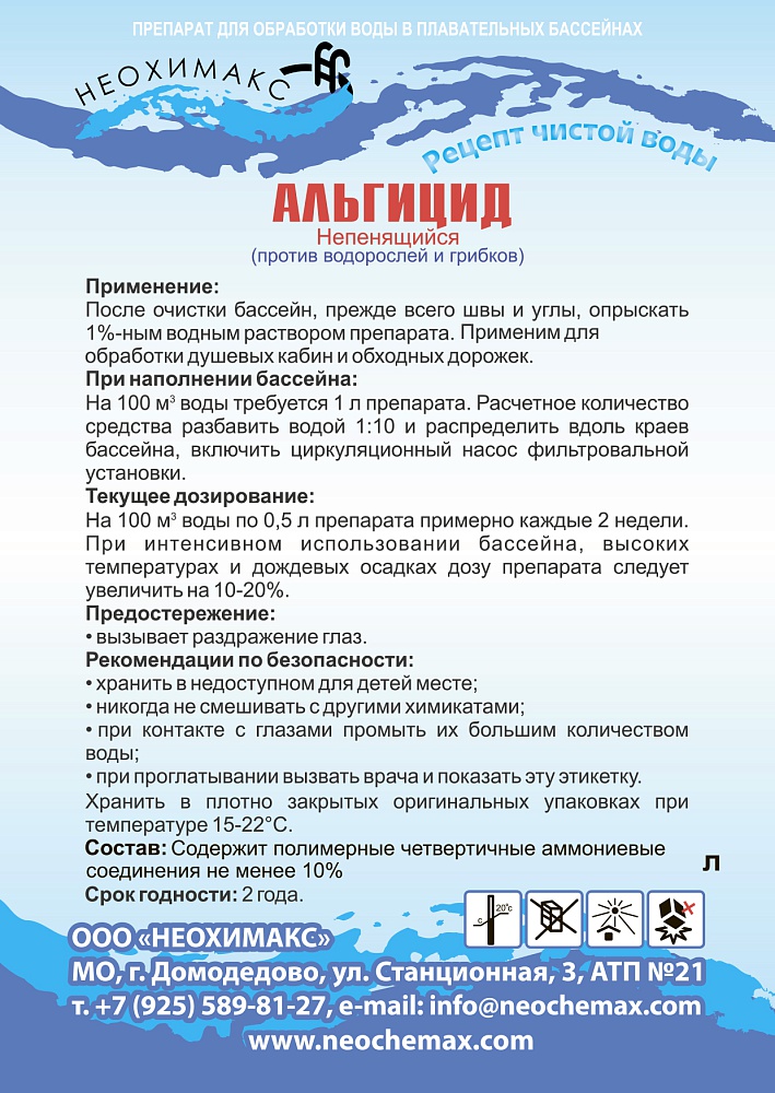 Препарат, предотвращающий рост водорослей, с которыми средства дезинфекции воды в бассейне не всегда могут справиться (особенно в открытых бассейнах). Поэтому воду необходимо периодически обрабатывать средством препятствующим росту и развитию водорослей.