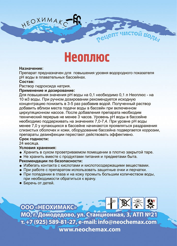 Для повышения значения рН воды на 0,1 необходимо 0,1 л Нео плюс- на 10 м3 воды. При ручном дозировании рекомендуется исходную концентрацию понизить в 3-5 раз разбавив водой. Полученный раствор добавить вблизи места подачи воды в бассейн при включенном циркуляционном насосе. После добавления препарата необходим технический перерыв не менее 3 часов. Уровень рН воды в бассейне необходимо поддерживать на значениях 7,0-7,4. При уровне рН воды менее 7,0 у купающихся в бассейне начинаются проявляться раздражения слизистых оболочек и кожи, оборудование бассейна подвергается коррозии, препараты дезинфекции перестают действовать эффективно.