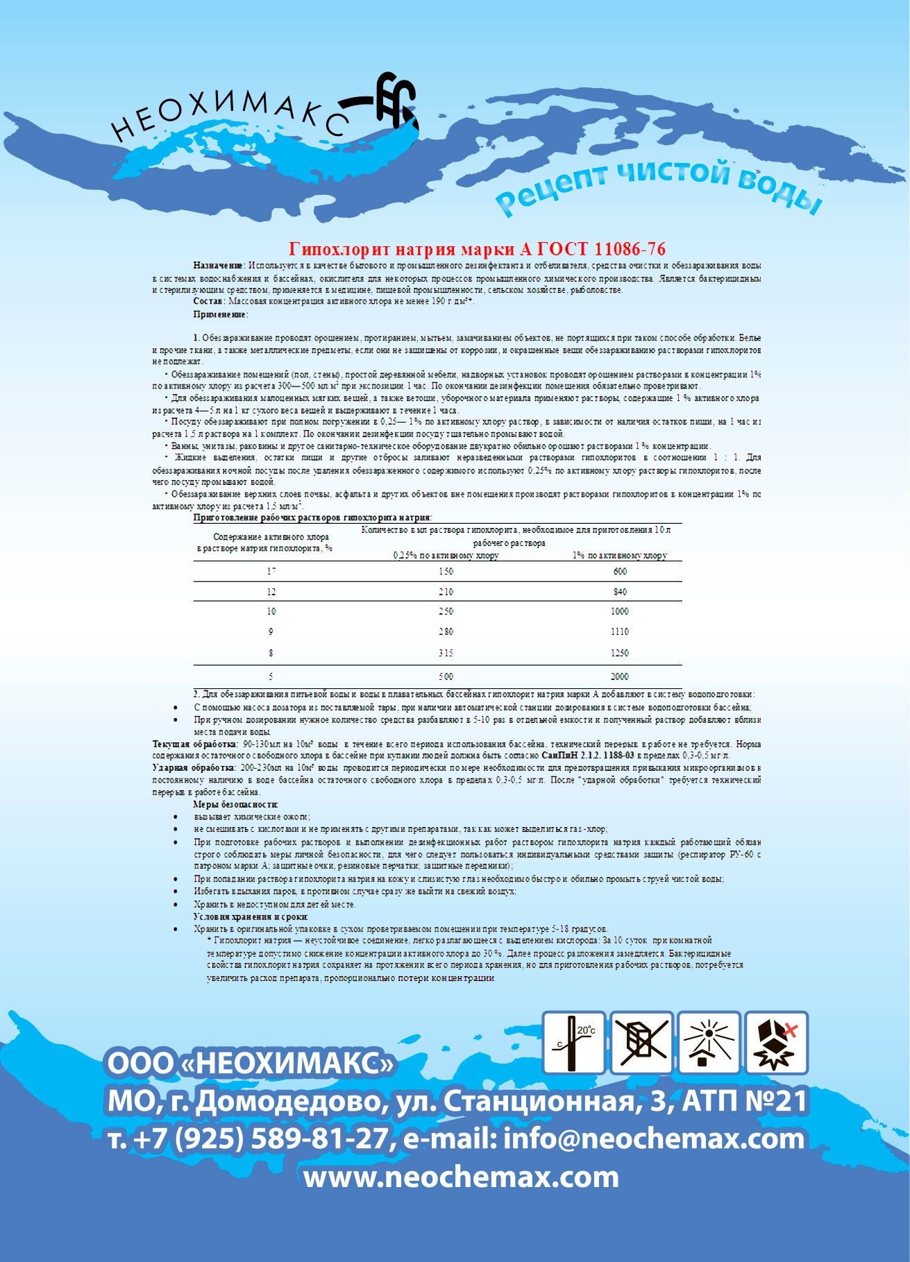 Состав: Массовая концентрация активного хлора не менее 190 г/дм³*.